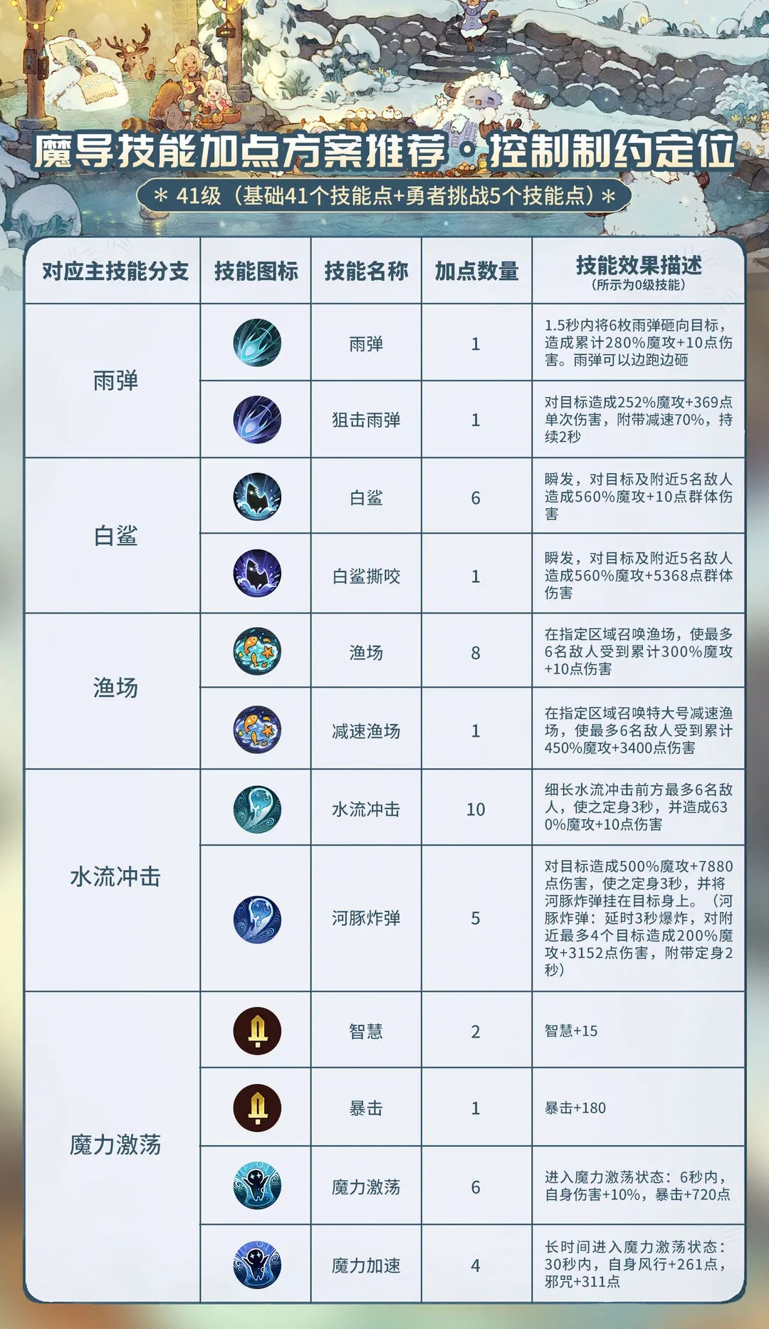 魔导有两套天赋方向(范围巨额输出、团队远程控制),适合不同作战场景、不同爱好的玩家;魔导是最适合范围清理小怪的职业,在早期的养成过程中除了战力评分外,攻击力和智慧是首选属性。