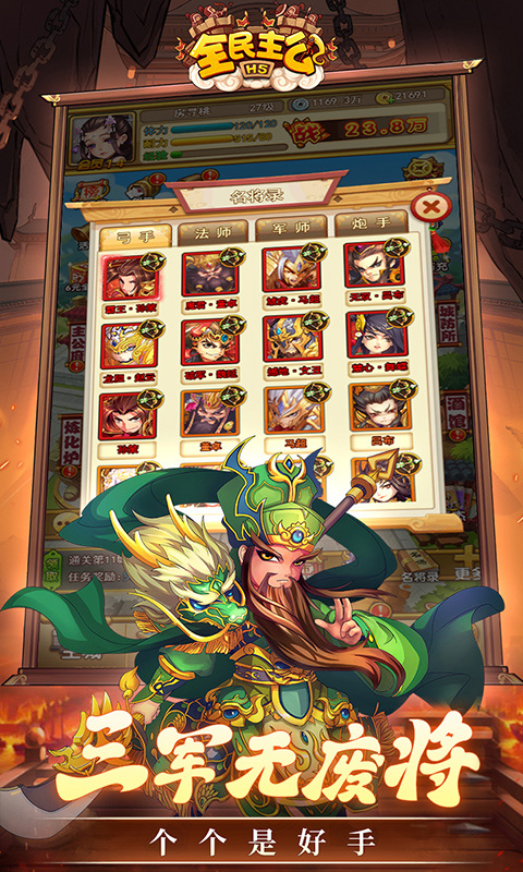 全民主公H5手游0.1折扣充值版是一款采用了Q版三国题材并且完美融入了策略塔防、角色扮演、卡牌养成等一系列元素为一体的手机游戏,这款游戏最大的亮点就是将原本充满杀戮的三国世界变得更加轻松,玩家在这里将会扮演一名主公的身份,将会招募到一众憨态可掬且极具魄力的三国武将为自己所用,能够在三国战场上轻松打响自己的名号。