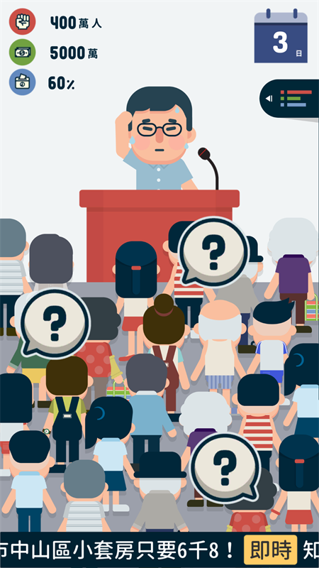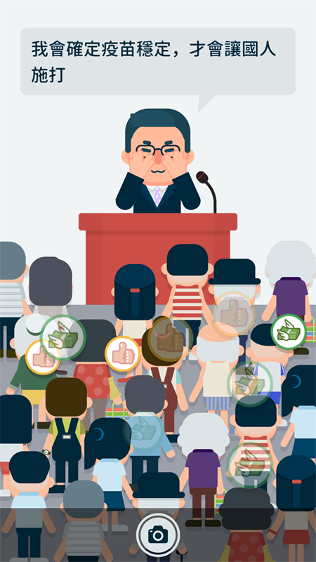 游戏中还加入了角色养成玩法,只有将角色培养的更加优秀才能获得更多的优势,发布惠民措施,通过演讲获得大家的支持。游戏采用非常简单的风格打造,搭配上非常欢快的背景音乐,带给玩家不一样的游戏体验。