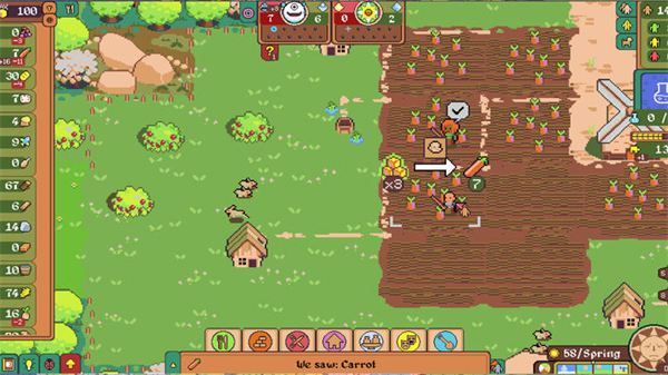 3、场景中自动生成的野果及果树每个对应生长季节只可以采摘一个循环,即改季节内完成采摘之后无法靠播种再生,所以要在有限资源消耗完毕前实现食物的可持续发展。