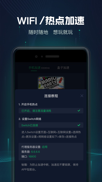 6、确认Switch连接至手机热点,此时弹窗内显示“Switch已连接”代表已经加速成功啦