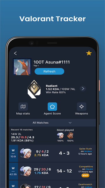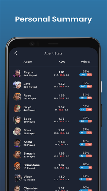 对您以前的比赛进行有效总结,快速纵览您当前的表现。您可以查看每个地图的统计数据、每个特工的排名详细信息以及对武器的了解程度,如杀人率死亡率支持率(KDA)、获胜率或平均命中率。