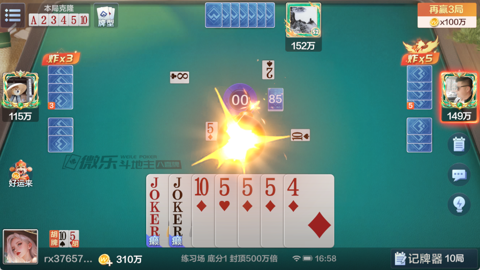 1、王牌可打出当炸,1个王炸2倍(连续王炸为2的N次方叠加)