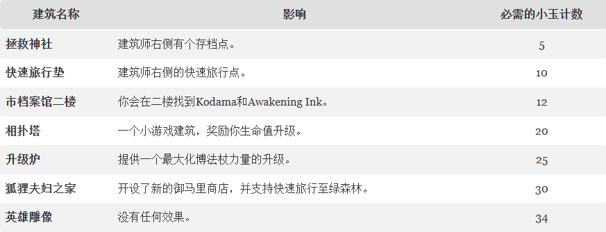收集小玉是一项极具成就感的活动,尤其是因为它与《樱花市的建筑师》有联系。为了让他建造新建筑,你需要收集一定数量的Kodama。这些建筑不仅仅是表面装饰;它们能带来有益的好处: