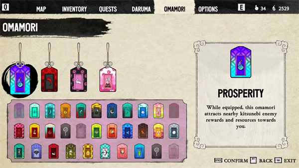 首先,别忘了从商店买Omamari表带。这会让你装备更多的御守。 每个御守都有不同的属性;有些专注于战斗,一些则帮助你更快移动或更高效地积累狐狸火。确保根据具体情况经常更换。