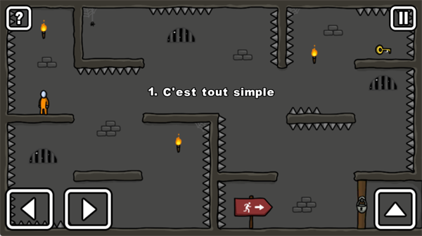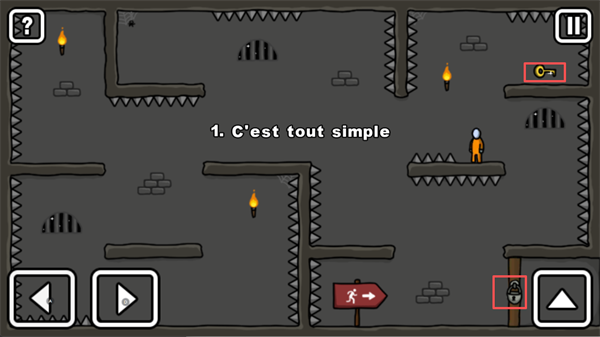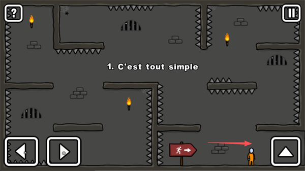 在第1关「C'esttoutsimple」中,玩家需要操控火柴人成功获取钥匙并打开出口大门,同时注意躲避沿途的尖刺陷阱,确保自身安全。