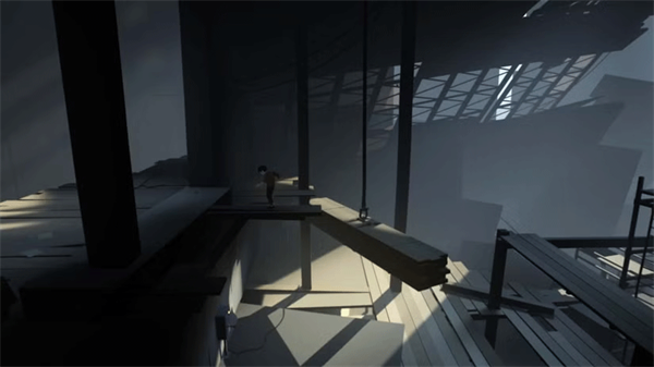 穿过木板,木板会断裂,让你掉到下一个房间。跳过右边的缝隙,然后从建筑右侧的管道爬下去。