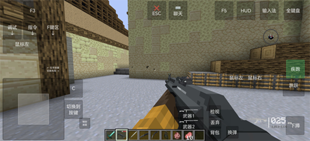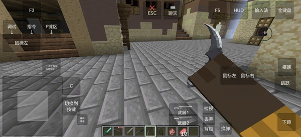 除各类枪械外,玩家还可使用近战武器,右侧虚拟按键支持疾跑、跳跃、下蹲等战术动作,提升战斗灵活性与生存能力。