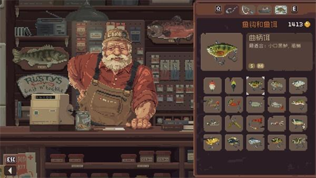 当你要换种新物种时,可以升级到稍微大一点的物种——小口黑鲈。小口黑鲈有S、M和L三种尺寸。不过,要开始钓它,你需要一个新的鱼饵——曲柄饵。只需15金币,卖完前三条鱼后,去钓具店取回。