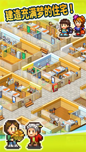 v2.4.3幸福公寓物语最新版也叫作“住宅梦物语”,是由Kairosoft(开罗)出品的一款公寓经营模拟游戏,玩家将在梦幻般的地图上扮演一名建筑师和房东,为各式各样的租客提供理想的场所,并观察他们长大、恋爱、结婚、生子、老去的过程,直至他们离开人世,体验人生百味。在这里玩家可以自由布置你的梦幻住宅,无论是和风还是游戏间等各种风格都能满足你的需求,还有更多个性化房间等你打造,并且还可通过各种道具改变居民的属性、职业、兴趣,帮助他们掌握自己的人生,在各个领域获得建树,在其日常生活互动中收获满满的幸福感和满足感,非常适合喜欢模拟经营类游戏的休闲玩家,感兴趣的玩家不妨在本站下载开始游玩。
