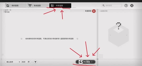 同理,如果你想要使用别人分享给你的蓝图,只需要点击“共享蓝图”按钮,再点击右下角的“导入蓝图”,再弹出的输入框中粘贴他人分享给你的蓝图代码,即可获得他人分享的蓝图!