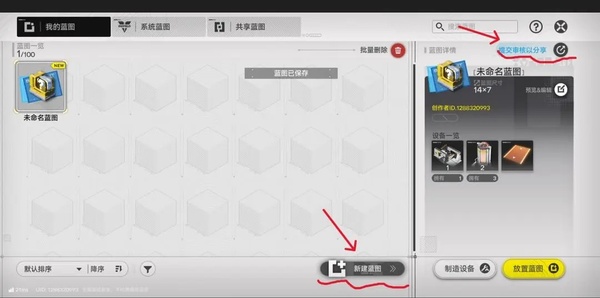 如果想要自己制作蓝图,则需要如下图在蓝图系统中选择“我的蓝图”,点击“新建蓝图”,在布局界面选择自己想要设计进蓝图里的设备,随命名保存即可;如果想要分享给他人,则需要另行提交审核。