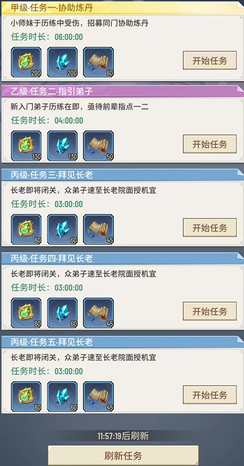 在大殿右侧设置了任务领取处,玩家可以接受各类宗门任务。不同任务拥有不同的完成时长和奖励等级。若当前任务不满意,还可通过刷新机制获取更高级的任务,提升收益。