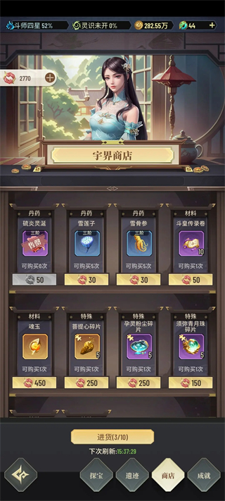 3、秘药可在宇界商店买满,但建议在斗者后期甚至斗师阶段再购入。前期境界提升较快,大境界突破期间商店不会刷新,因此早期购买效率不高。