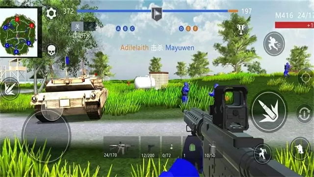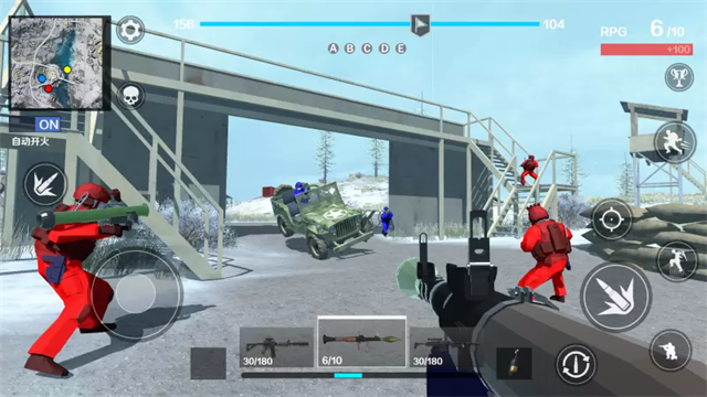 6、左下角滑动轮盘进行移动,右下角按键控制人物射击、跳跃、下蹲等功能。