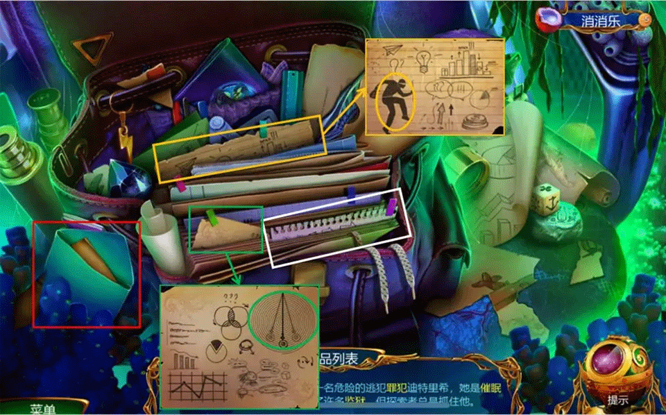 橙框:罪犯线索,先展开纸张,再点击纸上小偷图案。