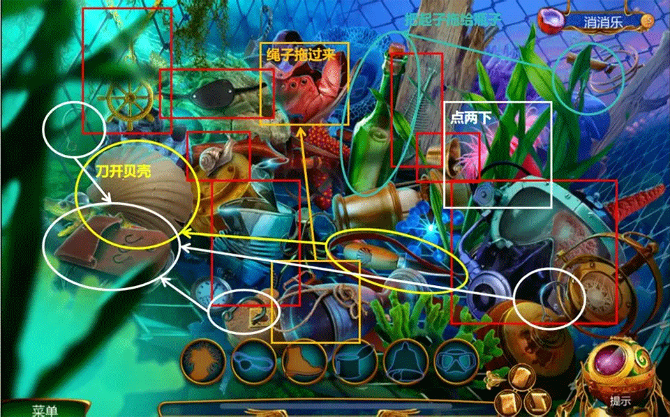 白圈位置:将钩子拖向袋子后,再点击袋子取得物品。