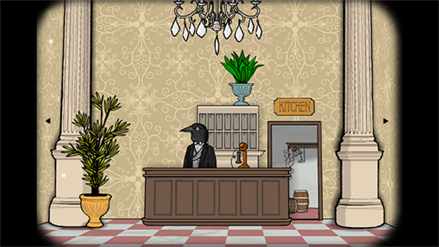 3、首先进入到前台,边上的门去往厨房。前台的五杯“鲜虾鸡尾酒”拿走(这丧心病狂的口味……)。点击乌鸦先生的时候他会说:“欢迎客人们的到来,周到体贴地为他们进行服务。”
