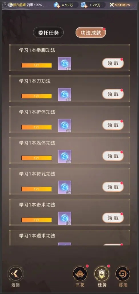 在炼气期的时候,只要跟着主线走就可以了。注意不要神游次数太多,任务需要几次就神游几次,或者需要升级的时候神游几次即可,通关试炼之地第十关的时候记得领取试炼之地的通关奖励,也有大量的修为奖励。