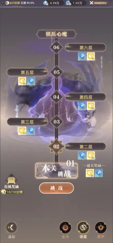 进入金丹期后,首先点到丹成九品界面,开始推关。这个越早通关给的丹气越多,丹气越多完成丹成九品就越快。