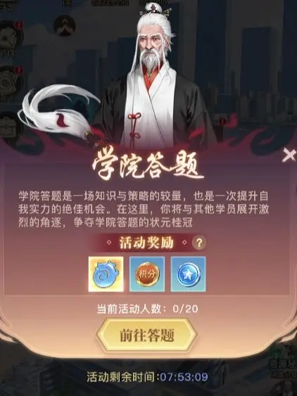 学院答题:学院答题回答对1道题就能获得奖励,一共能获得10次,因为获得的修为和大境界相关,所以如果当天开启的活动是学院答题,直接去答题就可以了。