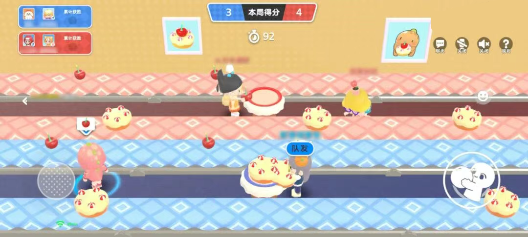 2、游戏中四名玩家分成两队,需要分别搬运樱桃和蛋糕,在中间的桌子上组装成樱桃蛋糕即可+1分