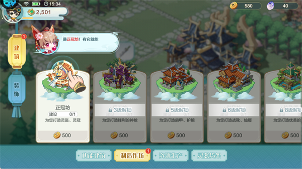 操作:优先建造正冠坊,解锁防具打造,完善法宝体系,提升弟子战力。