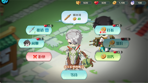 操作:新手期优先出售大招的桃木剑快速获取金币,后期可尝试涨价/打折提升收益,避免推销扣爱心。