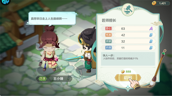 操作:金币足够时立即招募,高匠心匠师能大幅提升打造效率,是法宝养成关键。