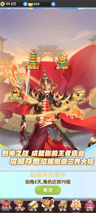 在角色达到70级并创角2天后,开启仙战玩法。参与仙教建设积累资源,攻城夺地争夺领地,解锁封神争霸,与其他玩家争夺三界霸主之位。
