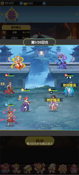 穿戴好装备后,进入战斗挑战,游戏采用回合制战斗机制,第2回合后可以跳过战斗,建议优先提升角色的物理防御等属性,这样更容易顺利通关。