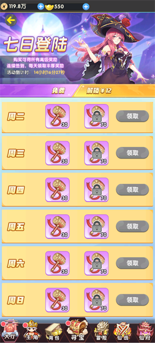 完成七日登录任务,玩家可以每日免费领取30金锤,解锁付费档次后,还能额外获得70金锤。金锤是寻宝的核心资源,建议在前期积累足够的金锤进行十连抽,提升高阶装备的获取概率。