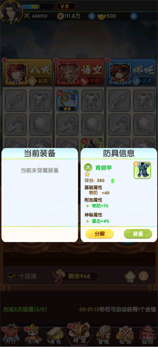 通过金锤砸蛋抽取装备,十连抽能提高高阶装备的获取概率,完成五次砸蛋后还会有额外福利,玩家可以选择将装备用于提升属性或分解获取资源,根据角色需求搭配最合适的装备。