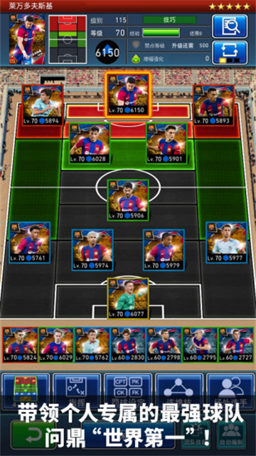 迅速集齐全队五星球员,切忌不要乱升级,只给五星球员升级,甚至90分的球员你可能升级到一定程度,比如40级就可以不用升了,给其他后面抽到的93+的球员升,核心原理在于,战斗力是根据你球队上场和替补决定的,而每个球员的战斗力都有天花板,尽量把宝贵的经验和金钱用在训练高分球员上,训练后期金钱需求是很大的!