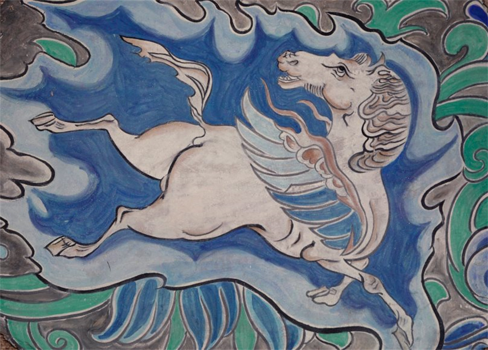 这匹翼马,位于敦煌榆林窟第10窟。白色的骏马肩生双翼,驻足回首,每一笔都勾勒出飞驰天际的动态美感。类似翼马形象也曾出现在波斯文化中,为古代东西方文化的碰撞融合提供了生动的注脚。