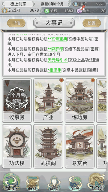 1、掌管宗门 — 是重视生产力种灵根提高修炼潜力?还是重视当下武力值潜心冥想创绝学?亦或是无为而治心思全用在游历上?全凭你个人喜好,因时制宜。